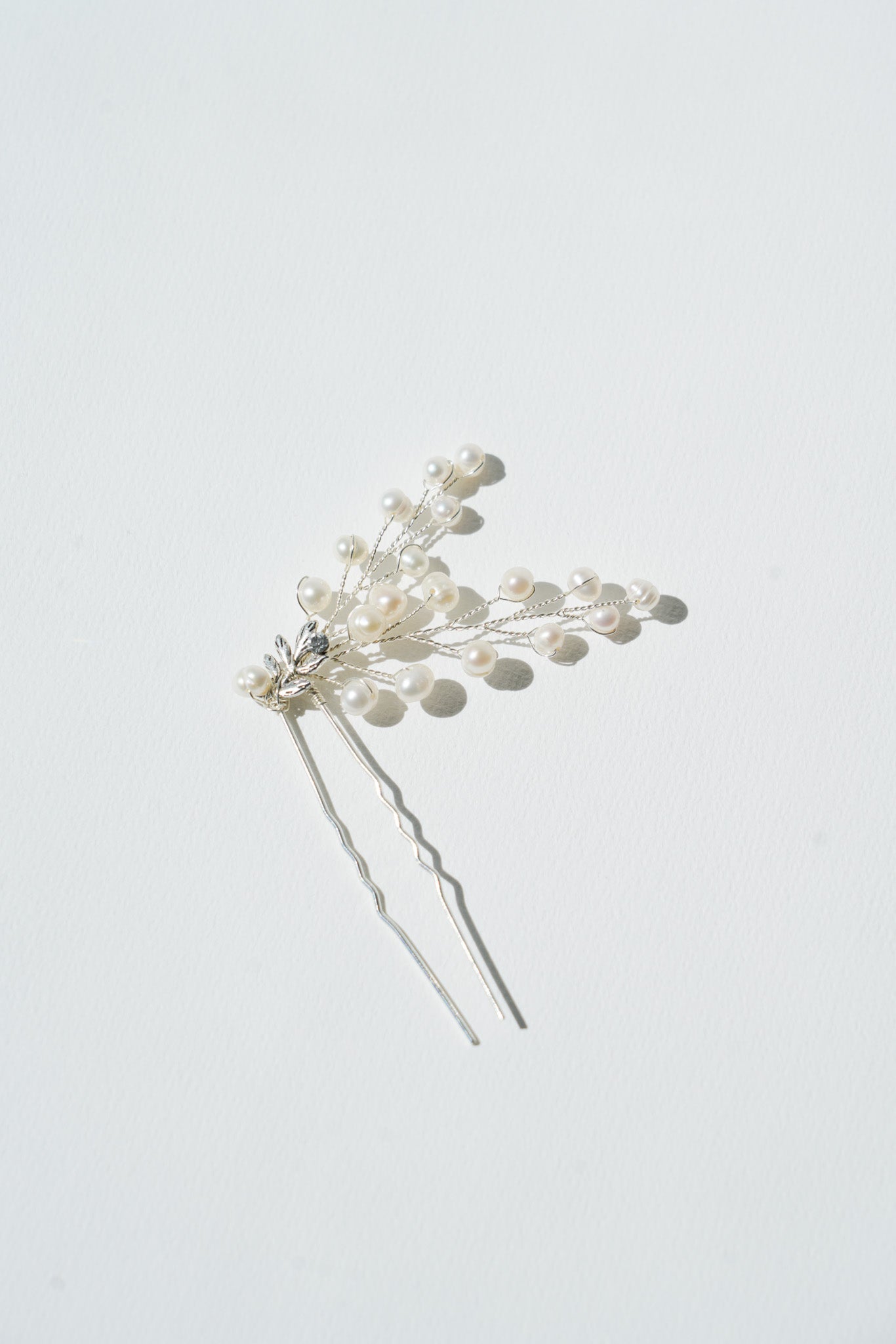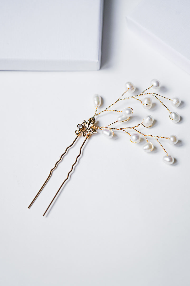 Cette jolie paire de pics à cheveux pour mariée a été conçue pour sublimer vos cheveux le jour de votre mariage. Ces accessoires de coiffure sont fabriqués a la main dans notre atelier. Chaque perle de culture est choisie avec attention pour former ce pic. Au milieu de celui-ci, des branches métalliques plaquées or 24k viennent ajouter une touche florale et romantique à ces pics.