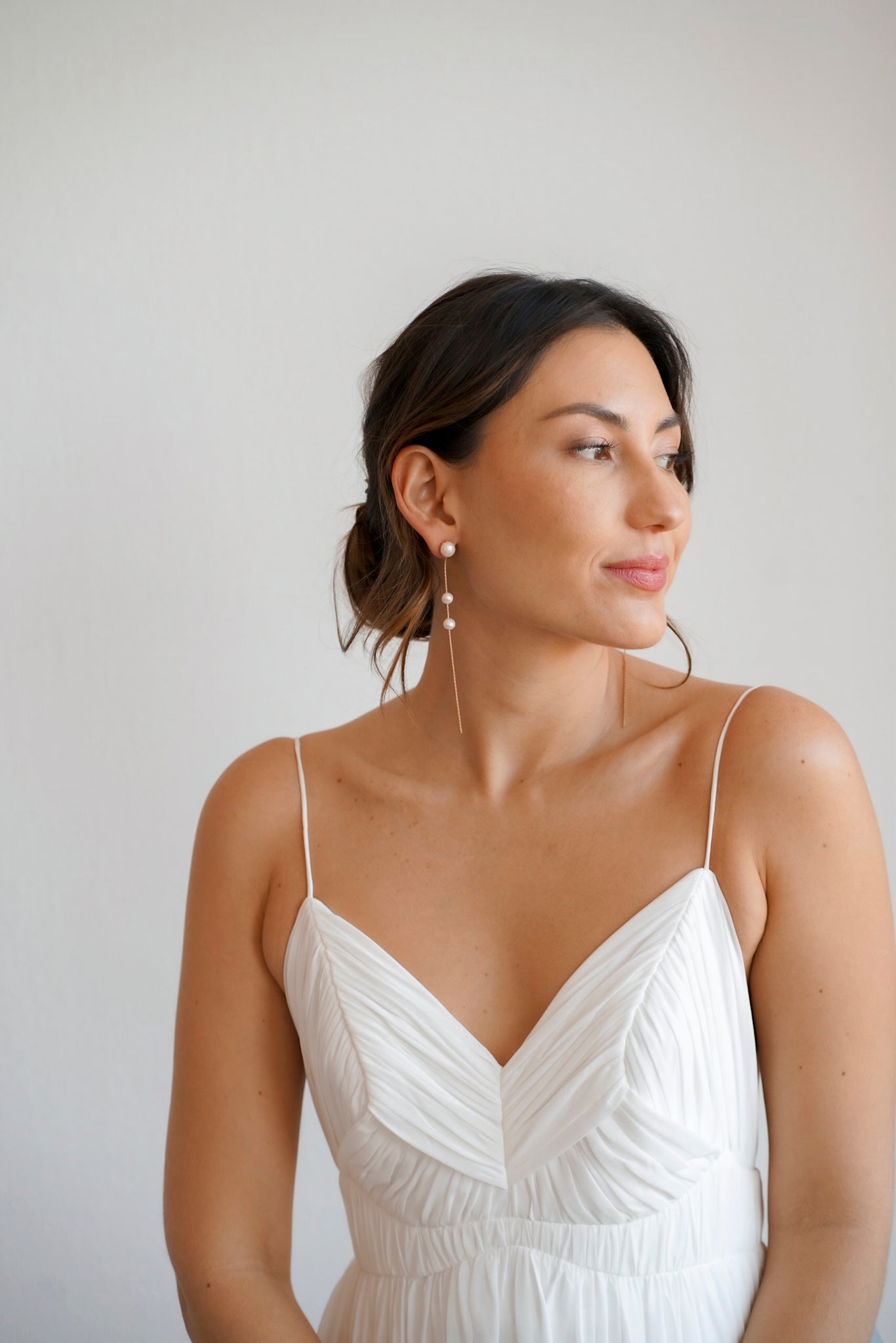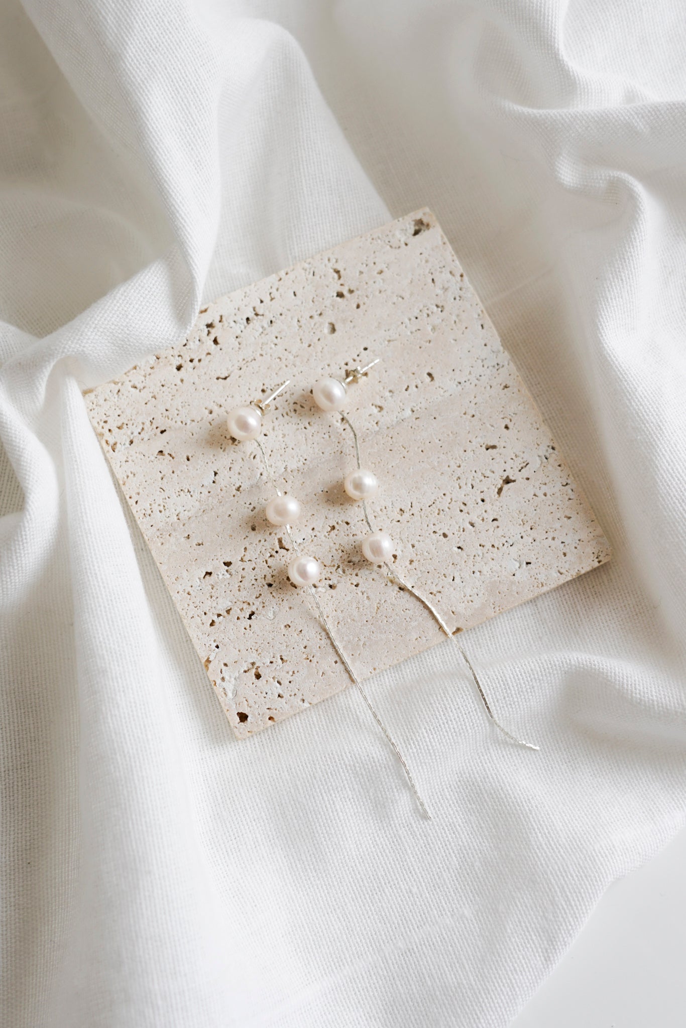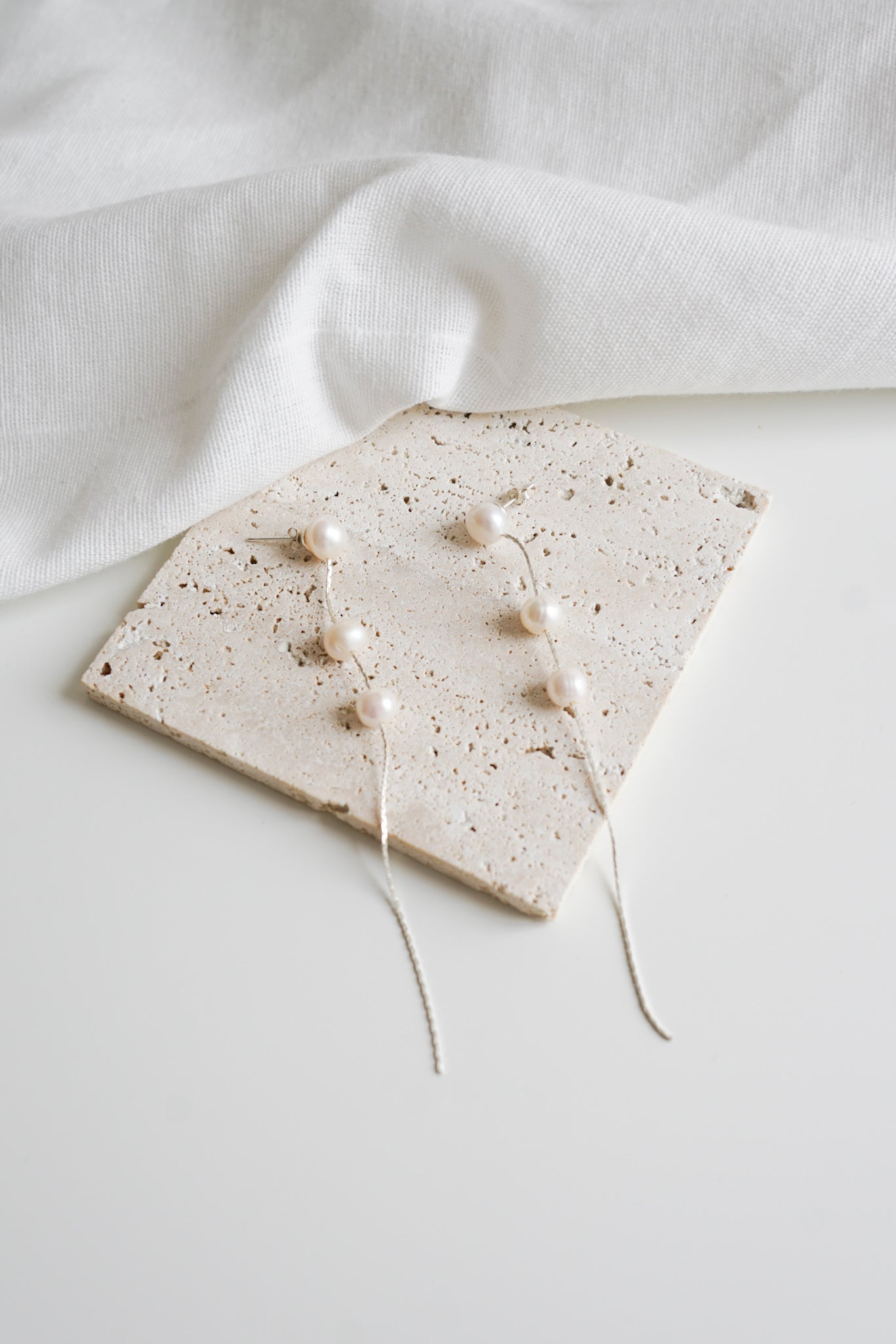 Ce beau bijou est fait avec une chaine fine plaquée en or 24k, à laquelle deux belles perles naturelles de culture et une perle rocaille y sont associées. Son attache d'oreille, recouverte d'une perle naturelle d'eau douce, vient porter cette belle chaine perlée.