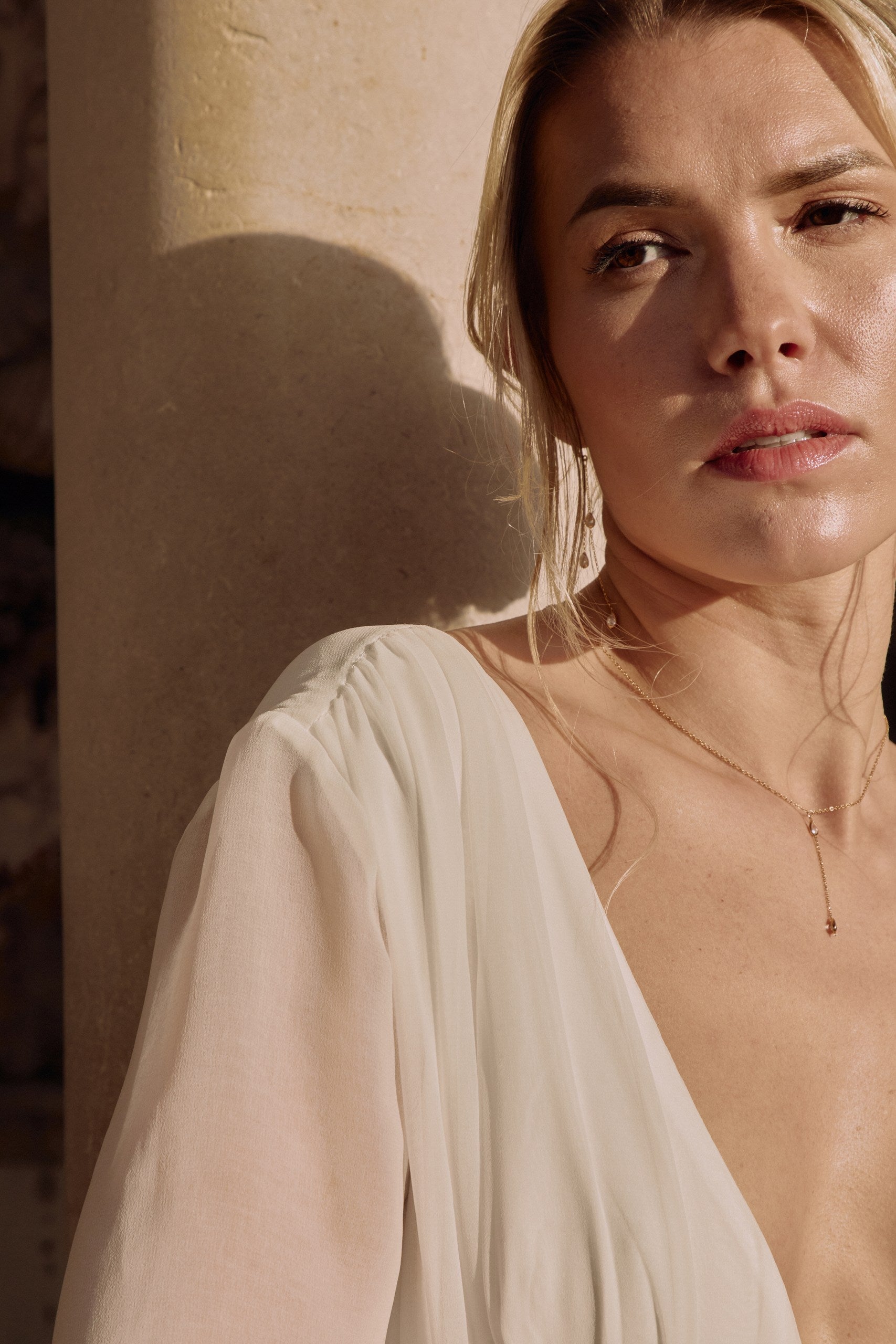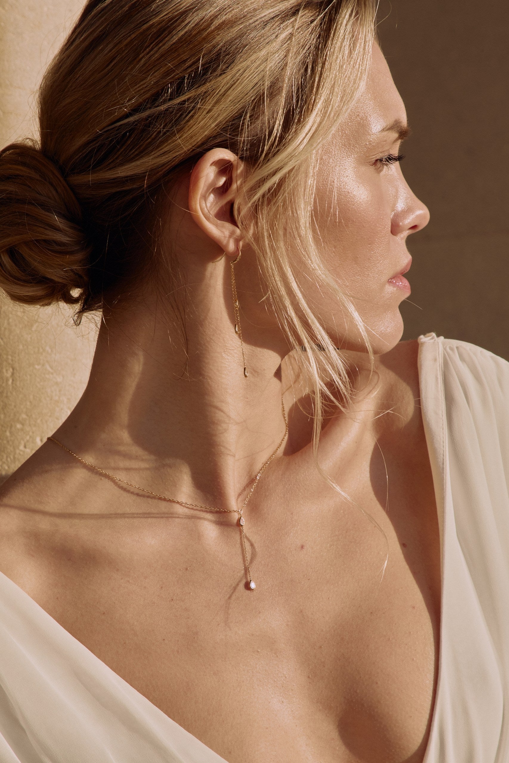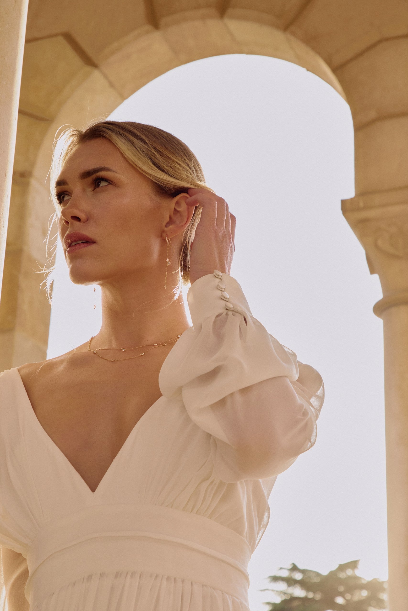 - : Un collier délicat à porter dans le dos, idéal pour un mariage élégant.