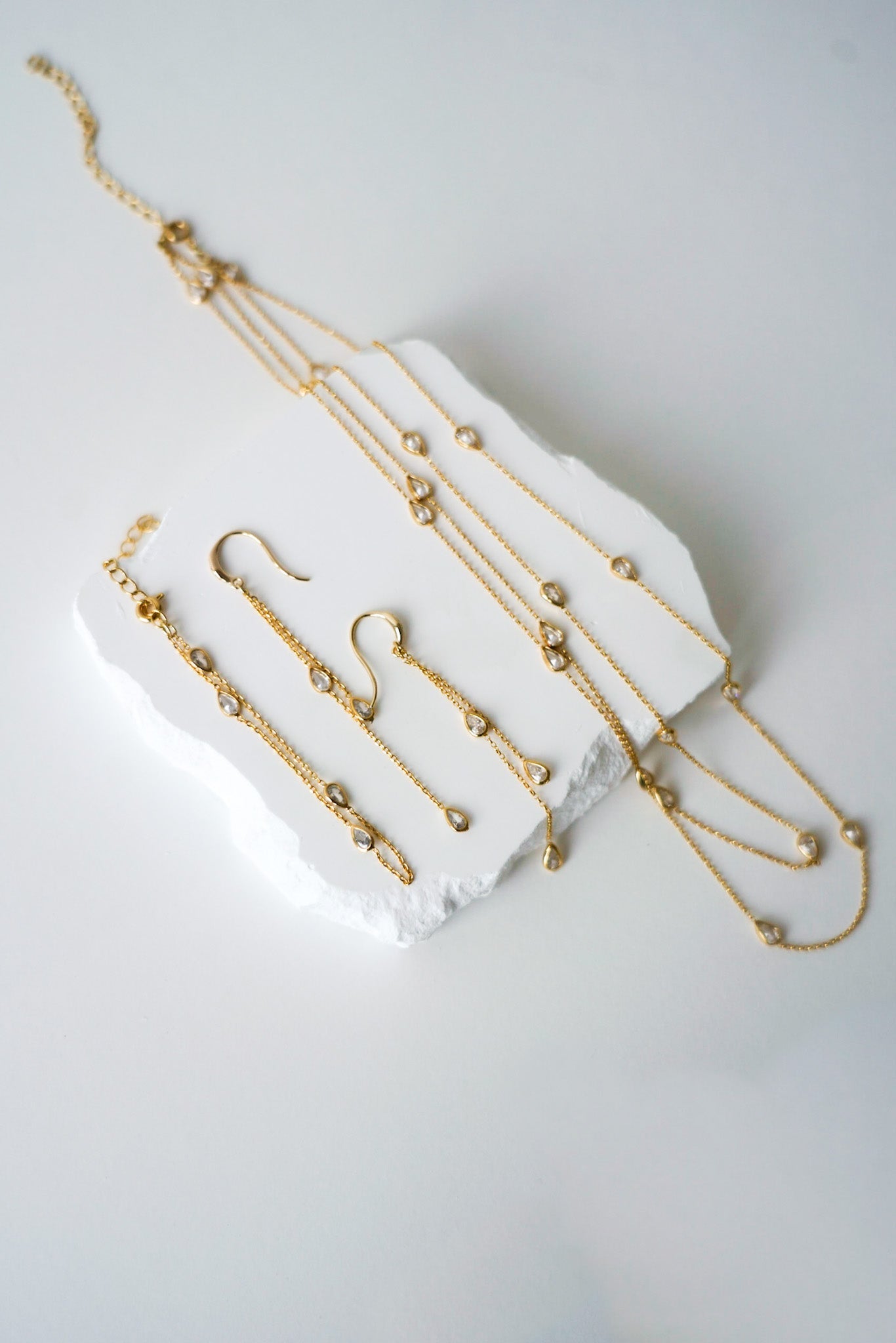 Ces belles créations, fabriquées avec des chaînes ornées de cristaux en forme de goutte et des crochets d'oreille fins ornés de zircons, raviront votre visage et apporteront du charme et du raffinement à votre tenue de mariage.
