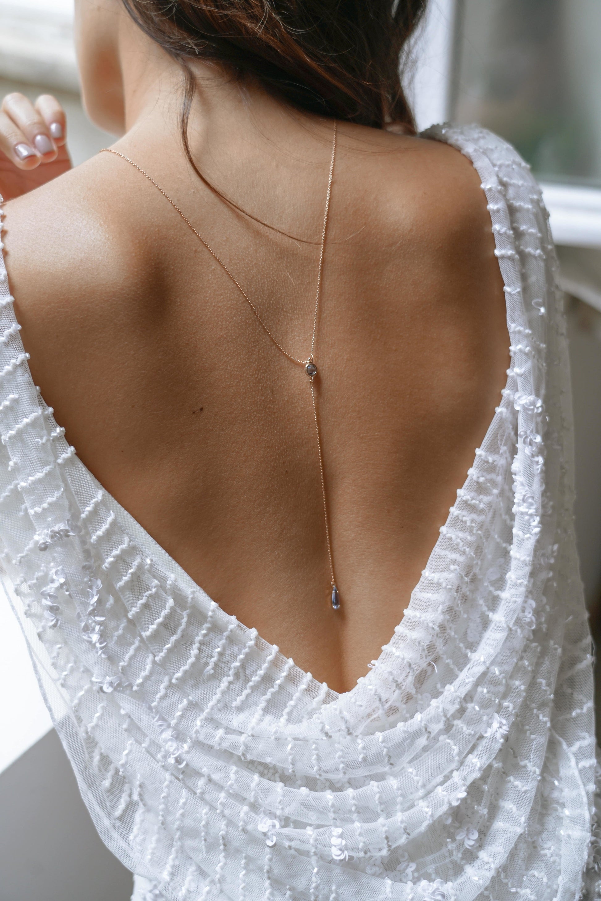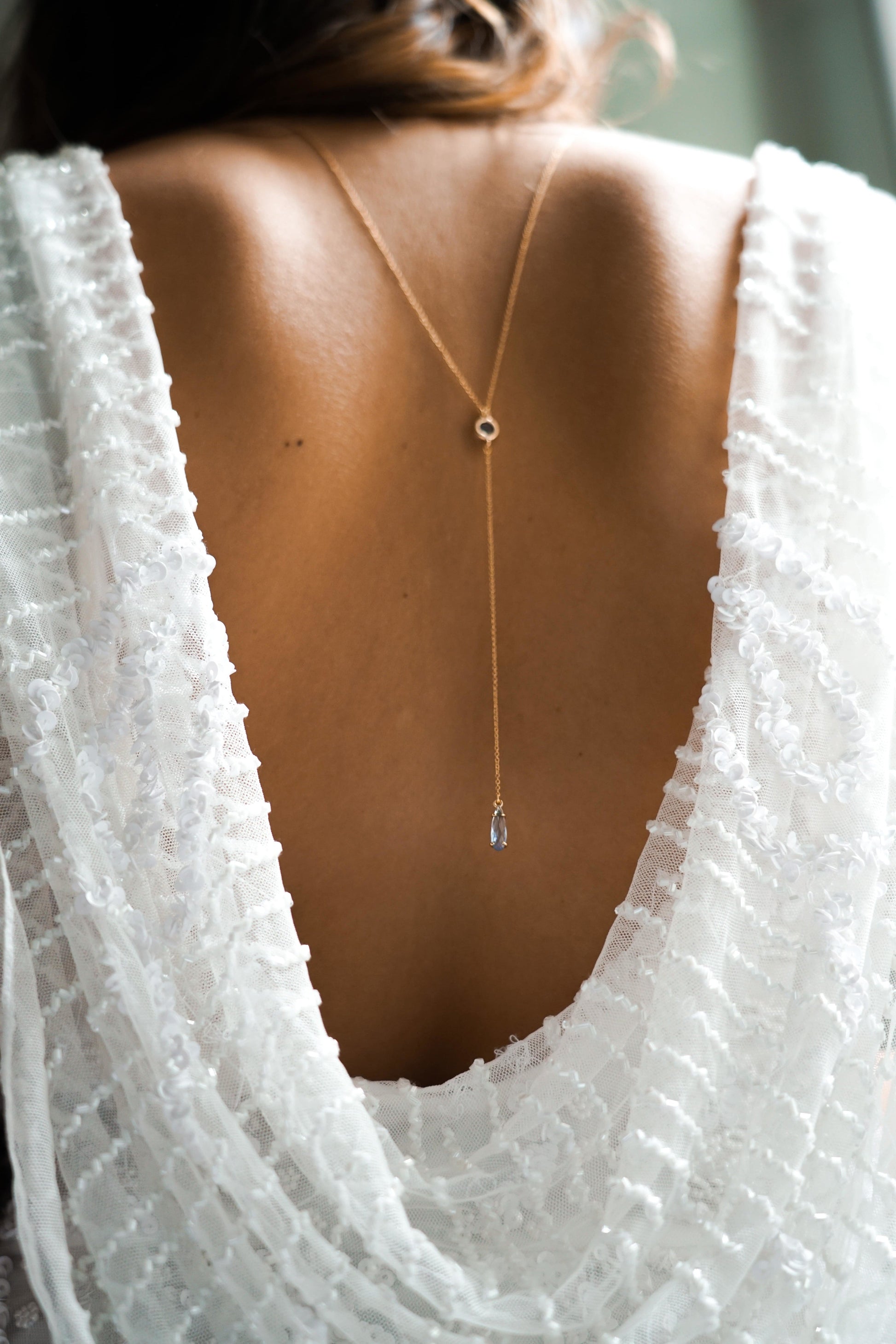 Magnifique collier pour un décolleté de dos avec des pierres bleues. Ce joli bijou de mariée est conçu pour la tradition de mariage "quelque chose de bleu".