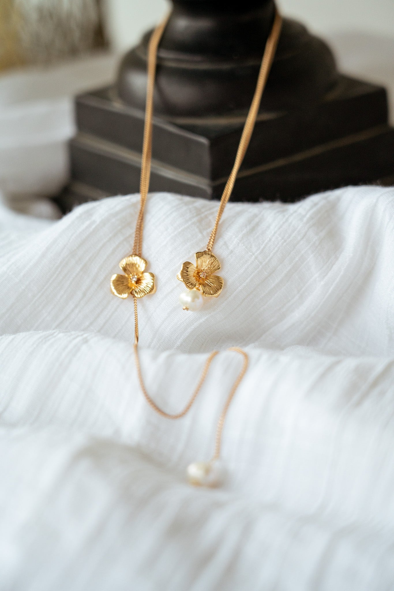 Cet accessoire a été crée avec des chaines fines et délicates et deux fleurs plaquées or de 24k. Chaque fleur est ornée d'un petit zircon au milieu. La fleur de devant est accompagnée d'une perle naturelle d'eau douce. Sur le dos, une perle ronde naturelle pend sur le bas.